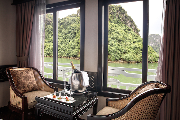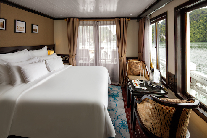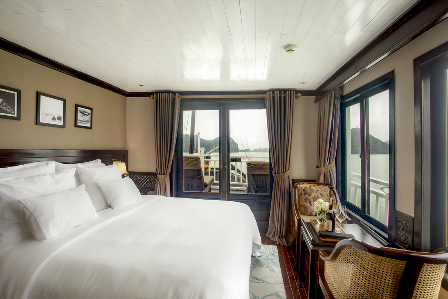 Located on the second deck, each Deluxe Balcony Cabin includes a private, furnished balcony, as well as all the amenities and features of the Deluxe Cabin. The private balcony ensures unobstructed views of the spectacular Halong Bay at any time of day or night - perfect for couples celebrating special occasions.